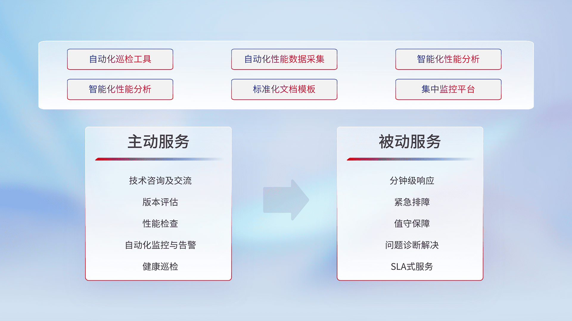 智能化工具和标准化文档,,,,保障服务质量,,,提供主动服务(包含技术咨询、、、、版本评估、、性能检查、、、自动化监控与告警、、、、健康巡检)和被动服务包含(分钟级响应、、、紧急排障、、、值守保障、、、问题诊断解决、、SLA服务)。。。